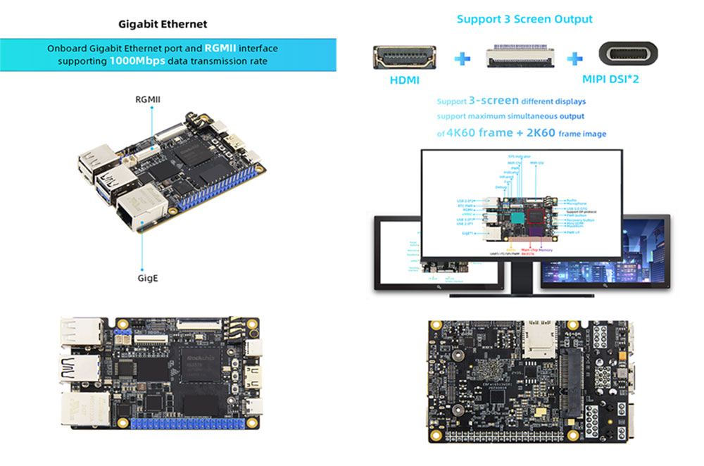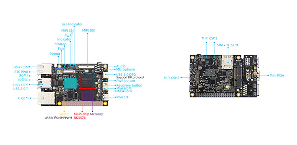 4.オンボードギガビットイーサネットポート、RGMII、USB3.0/2.0、ミニPCLE、ミニHDMI、MIPIスクリーン、MIPIカメラ、その他の周辺インターフェイス。