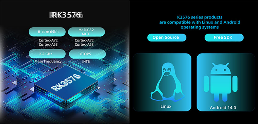 3。6TOPD NPU AIコンピューティングパワー(INT8/INT16混合精度)は、Raspberry Pi 5のCPU依存性AI処理に大幅に飛躍するハードウェアアクセラレーションAI推論を提供します。これにより、RK3576は、画像認識やセンサーデータ分析などのエッジAIタスクに最適です。